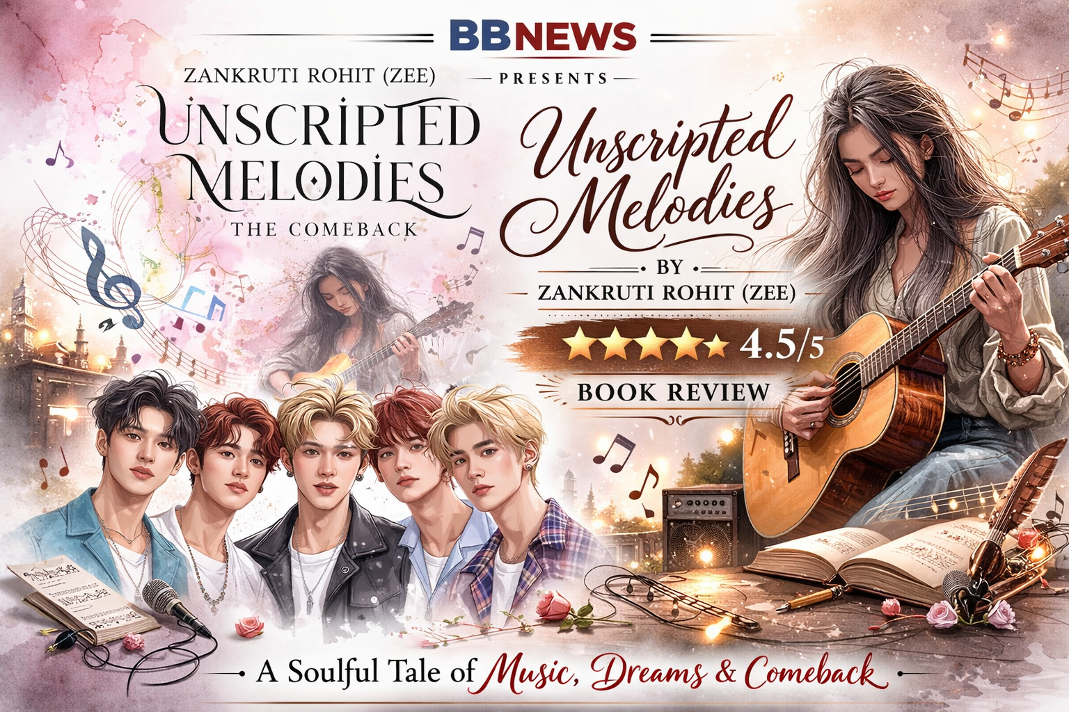 Unscripted Melodies: The Comeback by Zankruti Rohit feels like the kind of story that was written for girls like me — 26, emotionally invested in K-pop comebacks, slightly dramatic about fictional men, and deeply soft when it comes to stories about music and second chances. This book doesn’t just tell a story about artists; it feels like stepping into the behind-the-scenes world of a comeback era — the tension before the stage lights turn on, the silent sacrifices, the rehearsals that stretch past midnight, and the unspoken emotions that exist between people who have built something together.